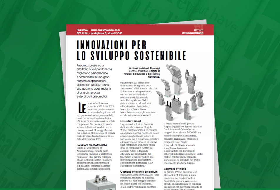 Pneumax presenta a SPS Italia nuovi prodotti che migliorano performance e sostenibilità in una gran numero di applicazioni, dal motion alla lastratura, alla gestione degli impianti di aria compressa e dei circuiti pneumatici.
