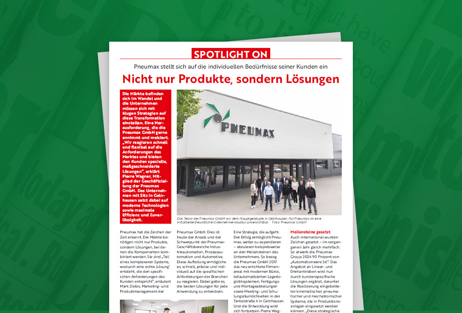 Pneumax hat die Zeichen der Zeit erkannt. Die Märkte benötigen nicht nur Produkte, sondern Lösungen, bei denen die Komponenten kombiniert werden. Sie sind „Teil eines komplexeren Systems, wodurch eine echte ‚Lösung‘ entsteht, die den spezifischen Anforderungen des Kunden entspricht“, erläutert Mark Ziebis, Marketing- und Produktmanagement der Pneumax GmbH.
