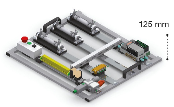 Per circuiti governati da PLC con movimenti in sequenza di tre cilindri di cui due lineari ed una mano di presa. Possibilità di trasformare segnali pneumatici liberati da fine corsa in segnali elettrici tramite pressostati. Monta isola di elettrovalvole a singolo e doppio solenoide pilotata da un sistema seriale. Include un regolatore elettronico proporzionale programmabile tramite tastierino a richiesta. All’ingresso è previsto un gruppo completo di trattamento aria.